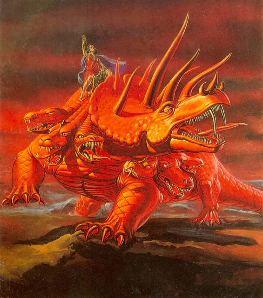 3 So he carried me away in the spirit into the wilderness: and I saw a woman sit upon a scarlet coloured beast, full of names of blasphemy, having seven heads and ten horns.